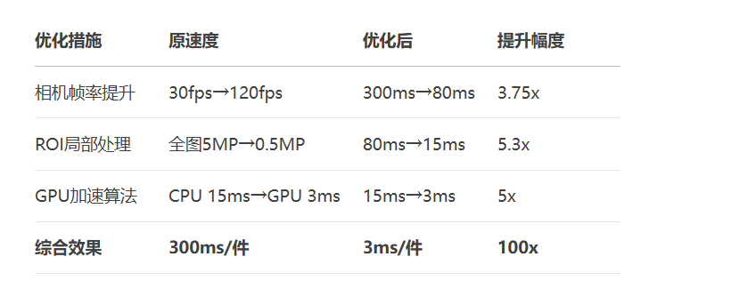 二、软件算法加速1. ROI局部检测 - 仅处理关键区域(减少90%图像数据量) - 动态ROI跟踪(适用于移动物体) 2. 并行处理架构 ```python 使用GPU加速示例(OpenCV + CUDA) import cv2 gpu_img = cv2.cuda_GpuMat() gpu_img.upload(frame) gpu_edges = cv2.cuda.createCannyEdgeDetector().detect(gpu_img) ``` 3. 算法优化 - 亚像素算法改进: - 传统:Zernike矩(15ms)→ 优化:灰度重心法(3ms) - 边缘检测:Canny→Scharr算子(速度提升2倍) 4. 深度学习加速 - TensorRT引擎优化模型 - 量化处理(FP32→INT8,速度提升3倍) 三、零部件尺寸CCD视觉测量机械与系统优化1. 运动控制优化 - 采用直线电机(加速度2g以上) - 电子凸轮同步(位置触发误差<1μs) 2. 多工位并行检测 | 方案 | 传统单工位 | 四工位并行 | | 节拍 | 5秒/件 | 1.2秒/件 | | 成本 | 1x | 1.8x | 3. 预处理工位 - 振动盘+视觉预定位(减少后续调整时间) - 自动清洁装置(避免污渍干扰) 四、通信与数据处理1. 数据流优化 - 内存映射传输(避免数据拷贝) - 零拷贝技术(DMA直接访问) 2. 分布式处理 ```mermaid graph LR A[相机1] --> B[边缘节点1] C[相机2] --> D[边缘节点2] B & D --> E[中央服务器] ``` 3. 实时系统部署 - Xenomai/Linux RT内核(延迟<50μs) - 确定性网络协议(TSN时间敏感网络)